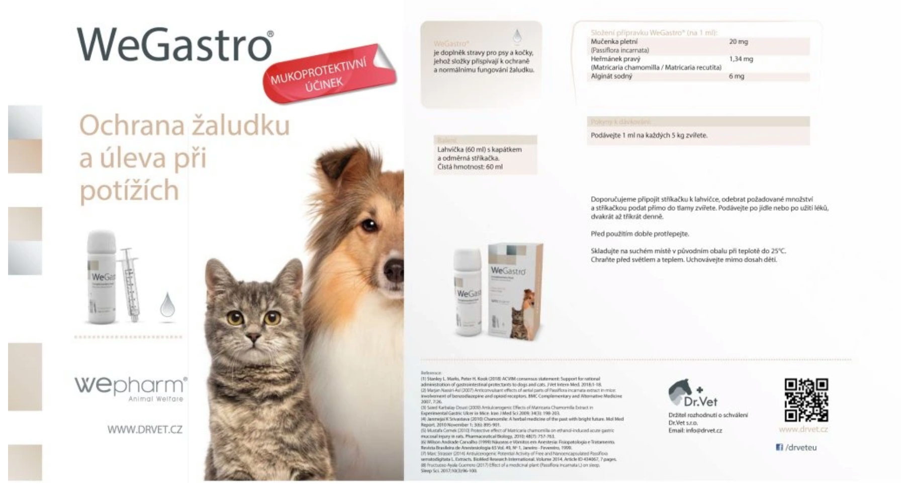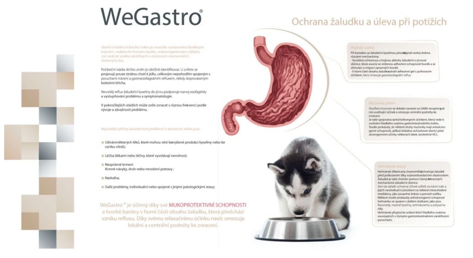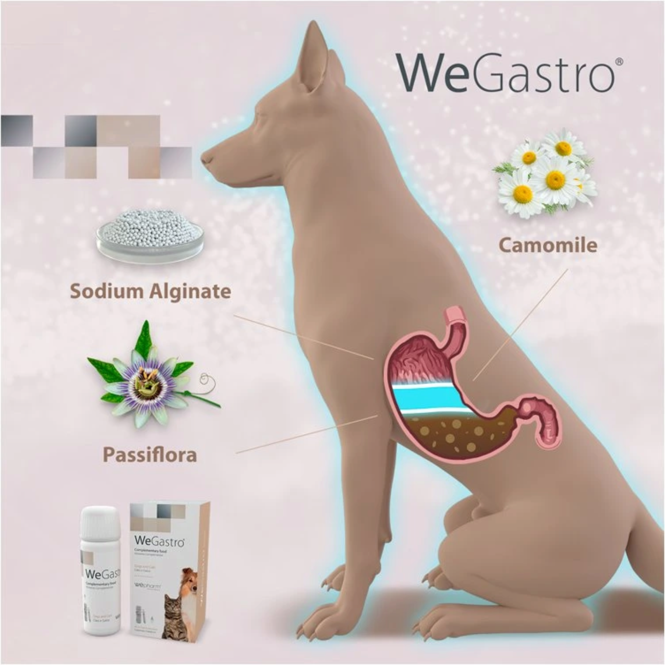 WeGastro® je doplněk stravy pro psy a kočky, jehož složky přispívají k ochraně a normálnímu fungování žaludku.