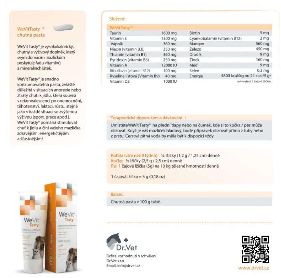 WeVit® Tasty je mimořádně chutná pasta, kterou si psi i kočky zamilují na první olíznutí. Díky lahodné chuti ji s radostí přijímají i zvířata s nechutenstvím, což z ní dělá ideální řešení pro doplnění vitamínů a minerálů během nemoci, rekonvalescence, stresu, ale i jako každodenní podpora zdraví a vitality. Spojuje v sobě vysokou funkčnost s potěšením pro vašeho mazlíčka.